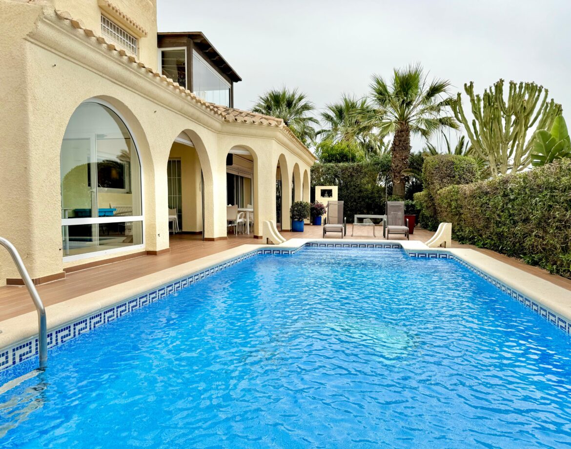 Villa independiente con piscina privada e impresionantes vistas al mar en primera línea de playa. Cuenta con dos plantas: